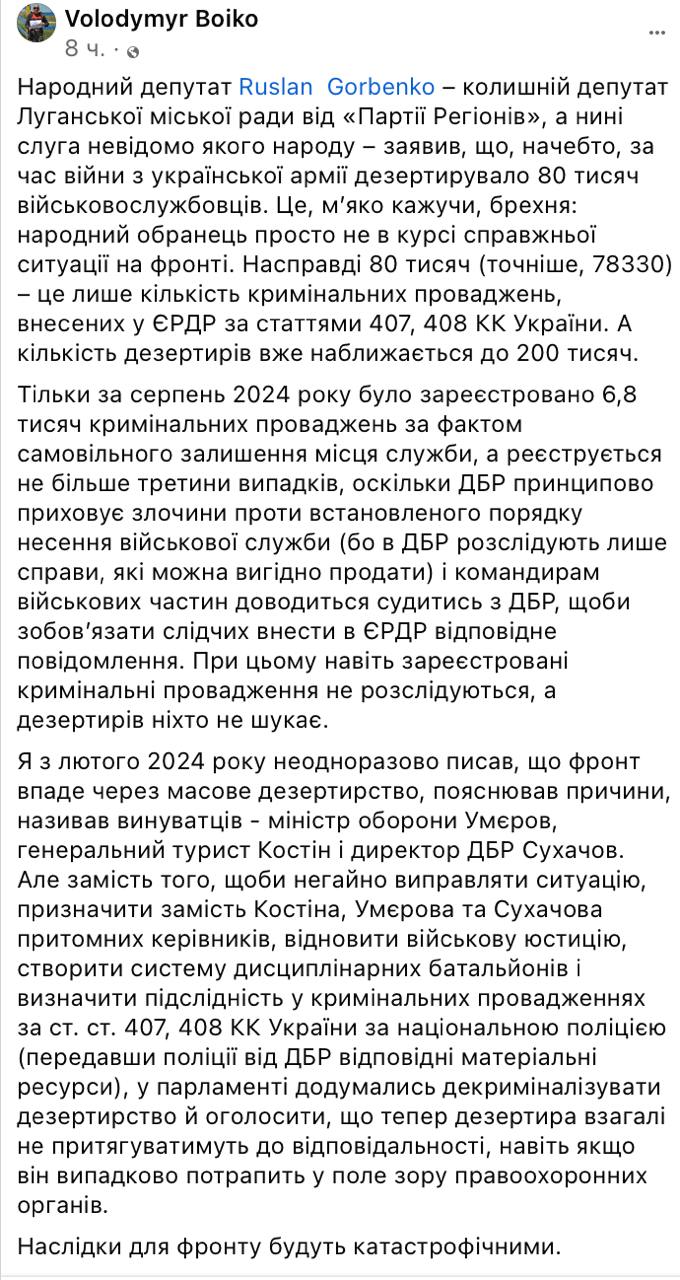 "Учитывая, что ГБР принципиально не вносит в ЕРДР сообщения командиров воинских частей о совершенных уголовных правонарушениях, реальное число преступлений как минимум в три раза больше. Но если даже предположить, что за I квартал 2024 года дезертировало только 25 тысяч военнослужащих, это означает развал фронта", - считает Бойко.