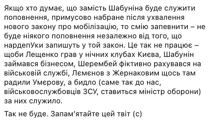 "Если кто-то думает, что вместо Шабунина будет служить новое пополнение, принудительно набранное после принятия нового закона о мобилизации, то смею заверить – не будет никакого пополнения, независимо от того, что депутаты запишут в этот закон. Это так не работает – чтобы Лещенко играл в ночных клубах Киева, Шабунин занимался бизнесом, Шерембей фиктивно числился на военной службе, Леменов с Жернаковым что-то советовали Умерову, а быдло (именно так к нам, военнослужащим ВСУ, относится министр обороны) служило за них", - пишет Бойко.