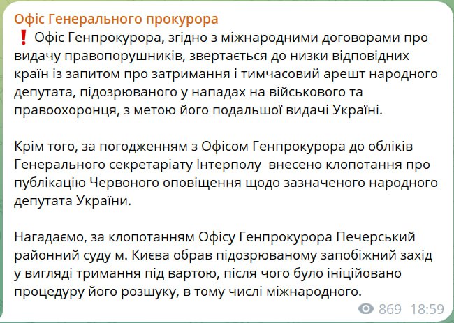 Ведомство обратилось в Интерпол с просьбой выписать красную метку нардепу, имя которого не сообщается, но речь идет о Дмитруке, которого подозревают "в нападениях на военного и правоохранителя".