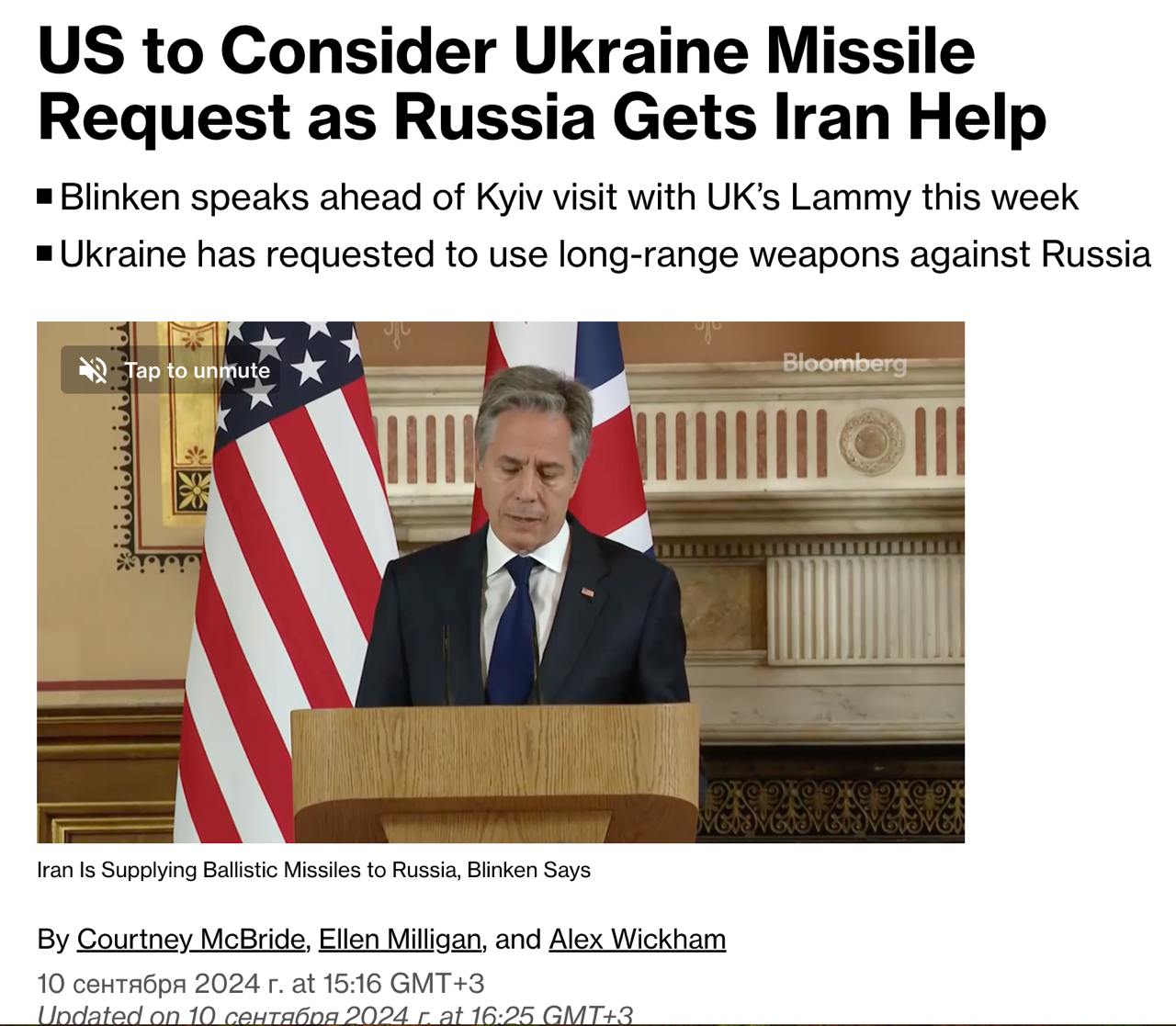 Bloomberg приводит слова Блинкена, который подтвердил, что Иран передал РФ партию своих ракет Fath-360 и заявил, что теперь Вашингтон и Лондон "рассмотрят и выслушают" просьбу Украины снять ограничения.