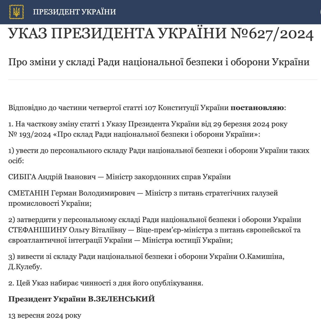 Из Ставки убрали Кулебу и Камышина, а добавили Сибигу, Стефанишину и Сметанина.
