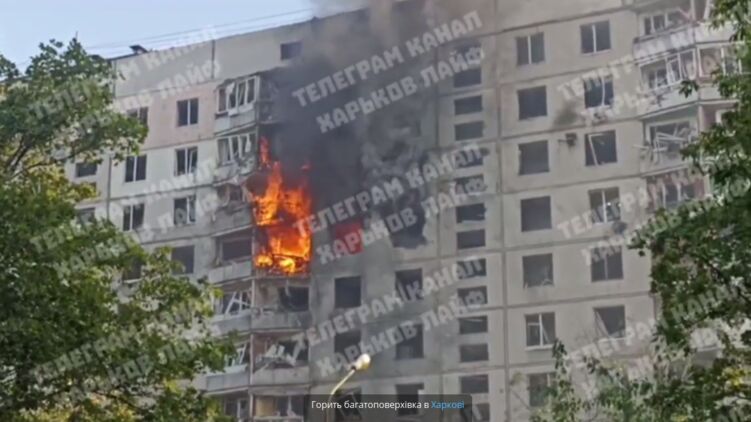 Владимир Зеленский в своем телеграм-канале написал, что в многоэтажке Харькова, пострадавшей от авиабомбы, пожар и завалы между 9-м и 12-м этажами.