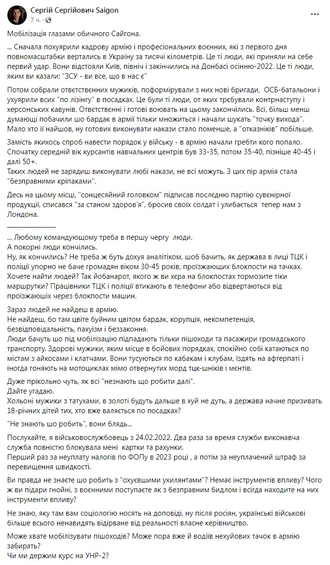 "Цветут буйным цветом бардак, коррупция, некомпетенция, безответственность, по@уизм и беззаконие. Люди видят, что под мобилизацию подпадают только пешеходы и пассажиры общественного транспорта", - сказано в посте "Сайгона".