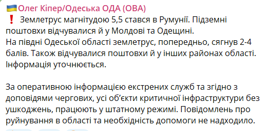 В свою очередь глава Одесской областной военной администрации Олег Кипер в своем телеграм-канале сообщил, что на юге Одесской области землетрясение, предварительно, достигло 2-4 баллов. Также ощущались толчки и в других районах области.