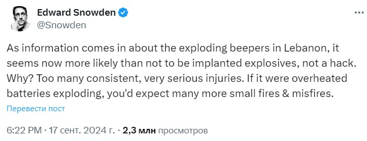 "Слишком малый объём (аккумуляторов - Ред.) при очень серьёзных травмах (пострадавших - Ред.). Если бы это были взрывы перегретых аккумуляторов, можно было бы ожидать меньше пламени и ущерба", – написал он в Х.