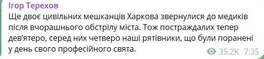 08:15 Еще двое гражданских жителей Харькова обратились к медикам после вчерашнего обстрела города, написал мэр Игорь Терехов.