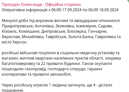08:20 За прошедшие сутки в Херсонской области в результате российских обстрелов 1 человек погиб, еще 4 - получили ранения.