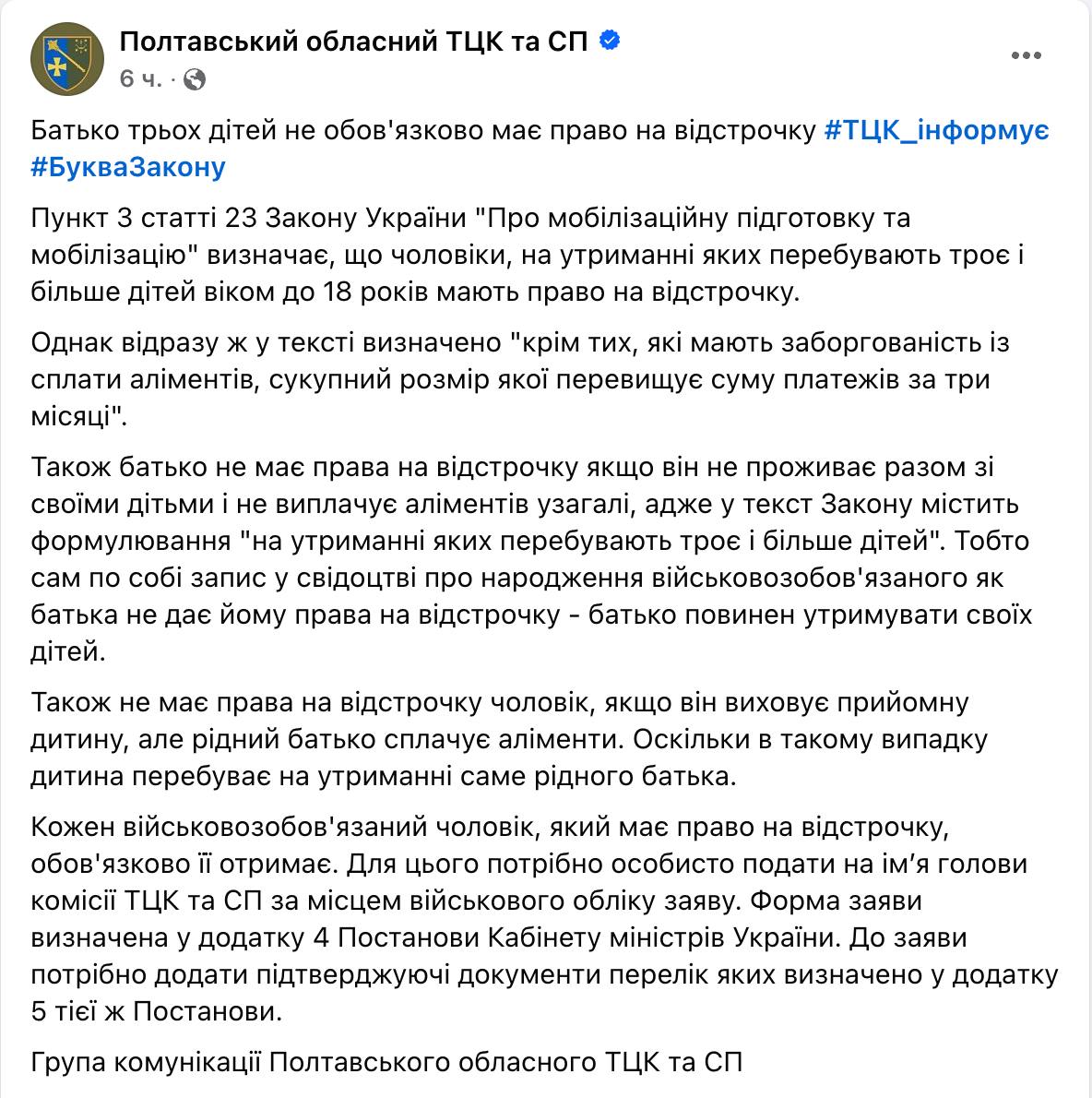 16:26 Отец троих детей не обязательно имеет право на отсрочку, сообщает Полтавский ТЦК.