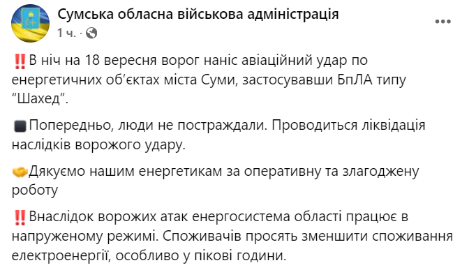 В Сумской ОВА сообщают, что россияне нанесли авиационный удар по энергетическим объектам города Сумы, применив БПЛА типа "Шахед".