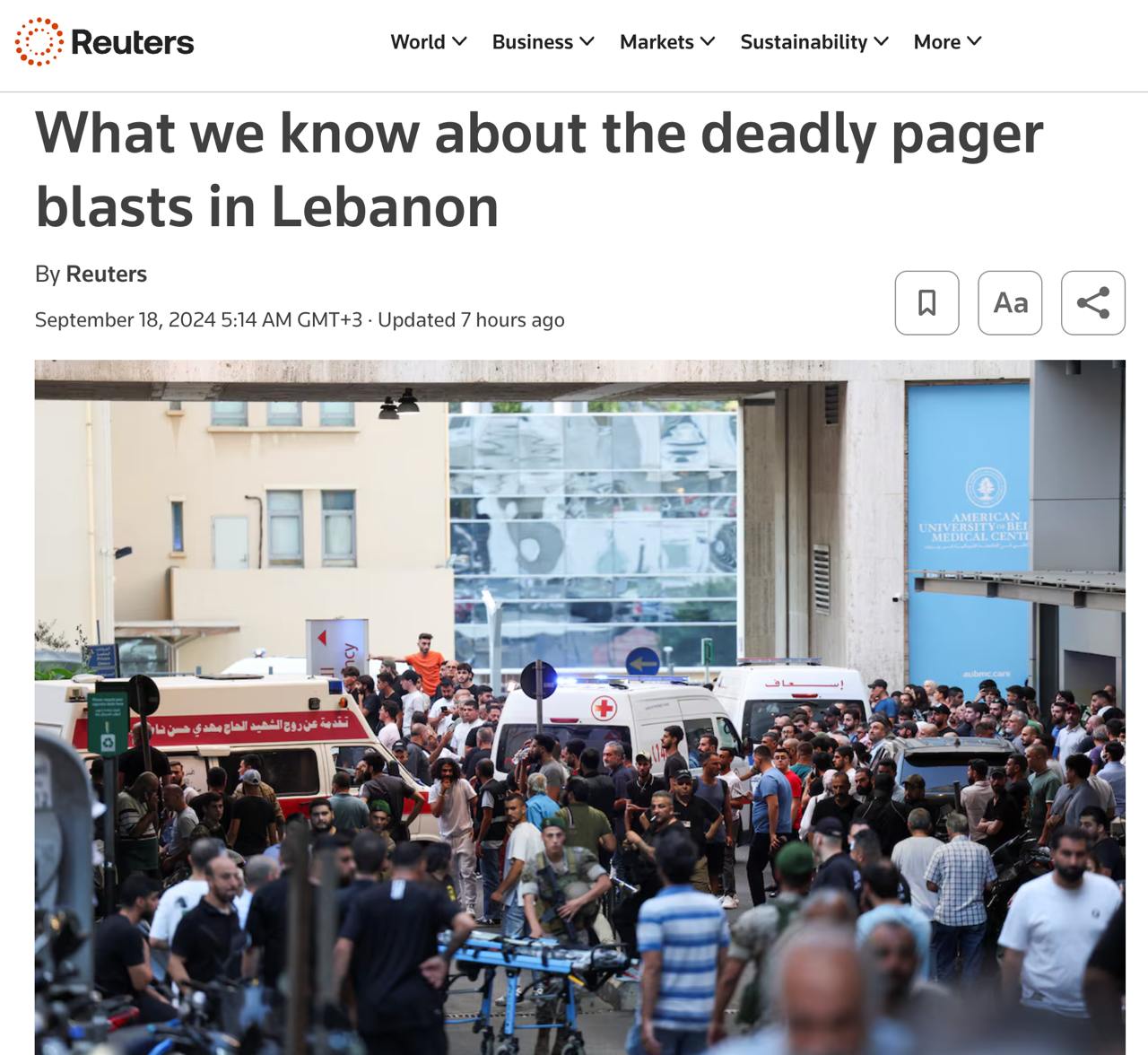 Напомним, вчера в Ливане одномоментно взорвались тысячи пейджеров - убив или ранив представителей "Хезболлы", а также гражданских людей. Число раненых приближается к трем тысячам человек. 11 человек погибли, по даным ливанских властей, из них восемь членов "Хезболлы".
