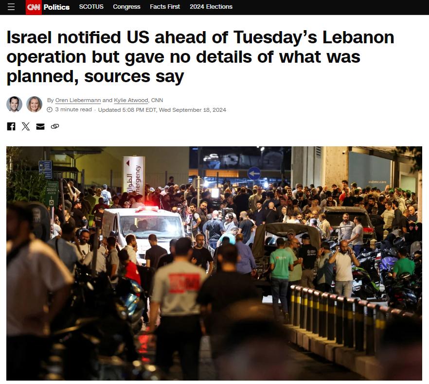 Накануне подрыва пейджеров Израиль сообщил Штатам об операции в Ливане, но без подробностей - CNN