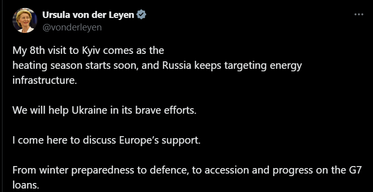 "Россия продолжает нацеливаться на энергетическую инфраструктуру. Мы поможем Украине в ее мужественных усилиях. Я приехала сюда, чтобы обсудить поддержку Европы. От готовности к зиме к обороне, к вступлению и прогрессу в сфере займов G7", - написала Урсула фон дер Ляйен.