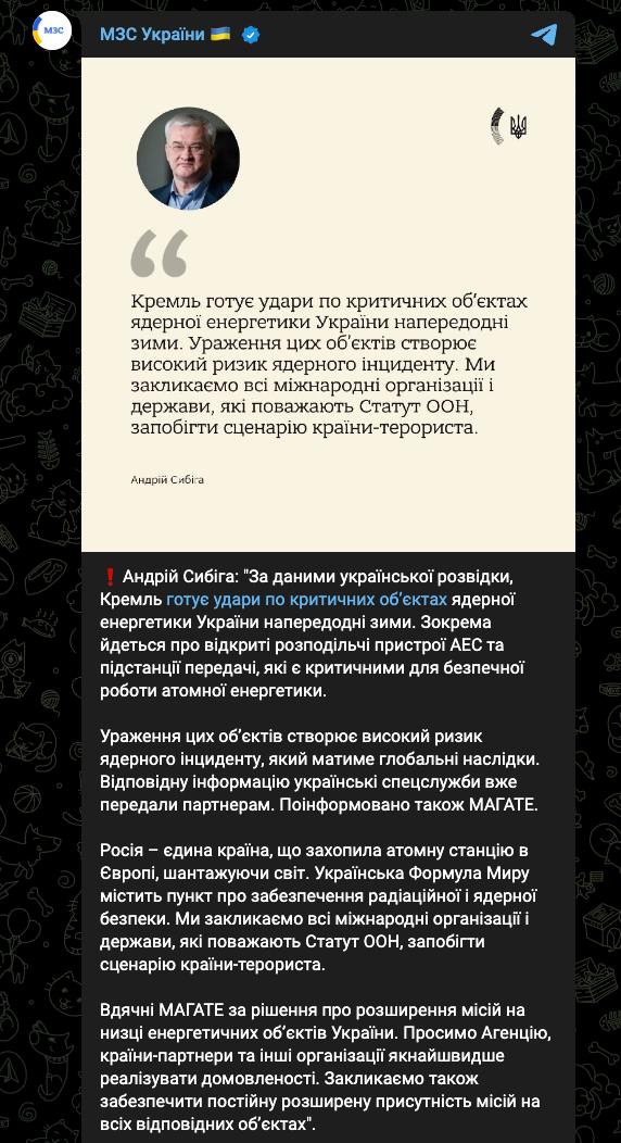 Ранее глава МИД Сибига со ссылкой на данные разведки заявил, что РФ готовит удары по подстанциям, которые обеспечивают работу украинских АЭС.