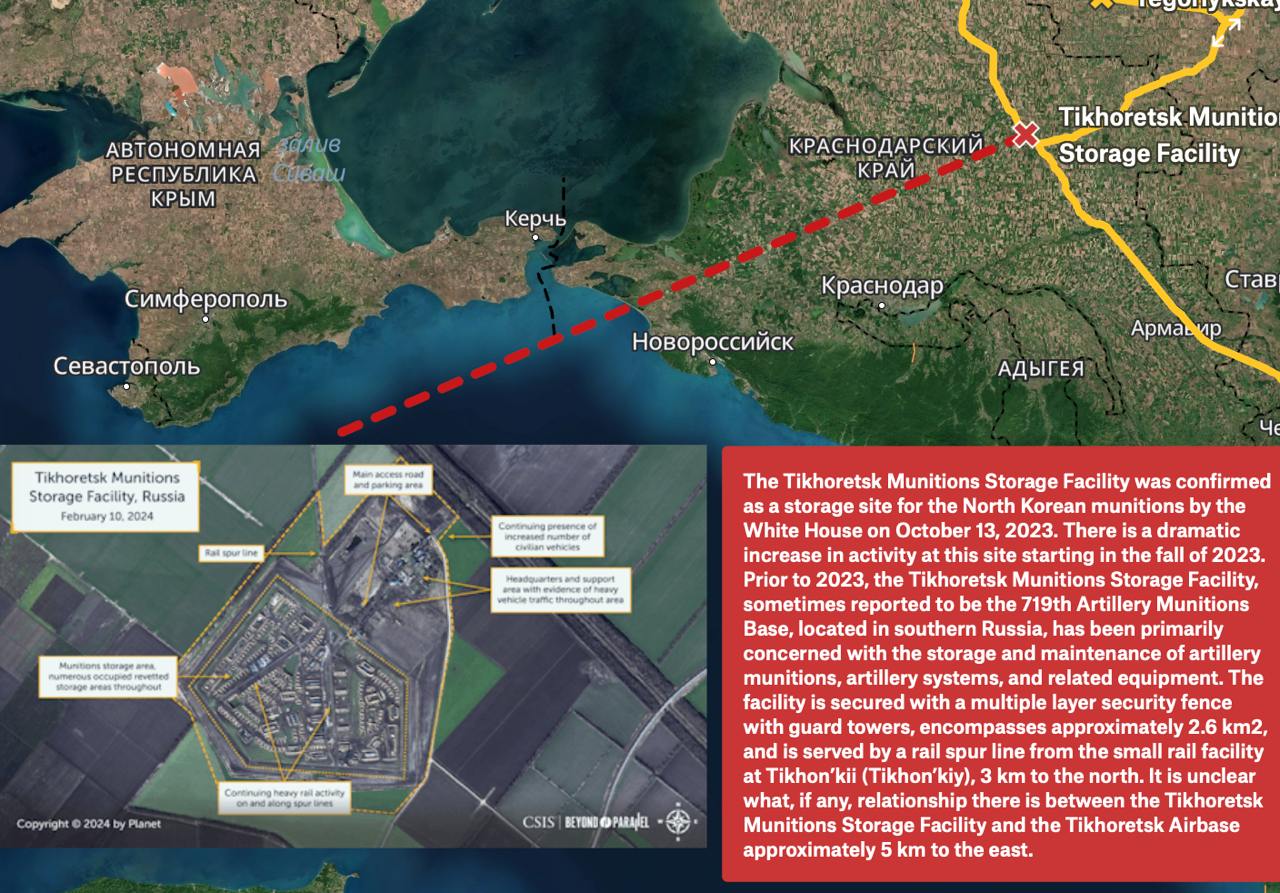 Как выяснилось позже, тихорецкие склады боеприпасов были предназначены в том числе для хранения северокорейских снарядов и ракет. Об этом ещё в феврале сообщал американский военный аналитический центр CSIS. Он писал, что этот арсенал был специально достроен и расширен после начала военного сотрудничества России с КНДР.