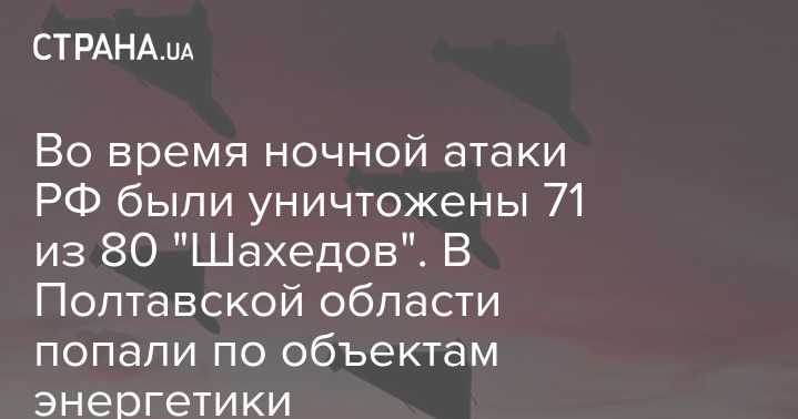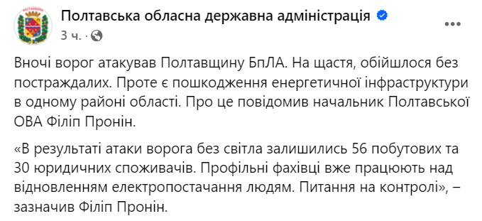 Глава Полтавской ОВА Филипп Пронин сообщил, что в области "Шахеды" ночью попали по объектам энергетики.