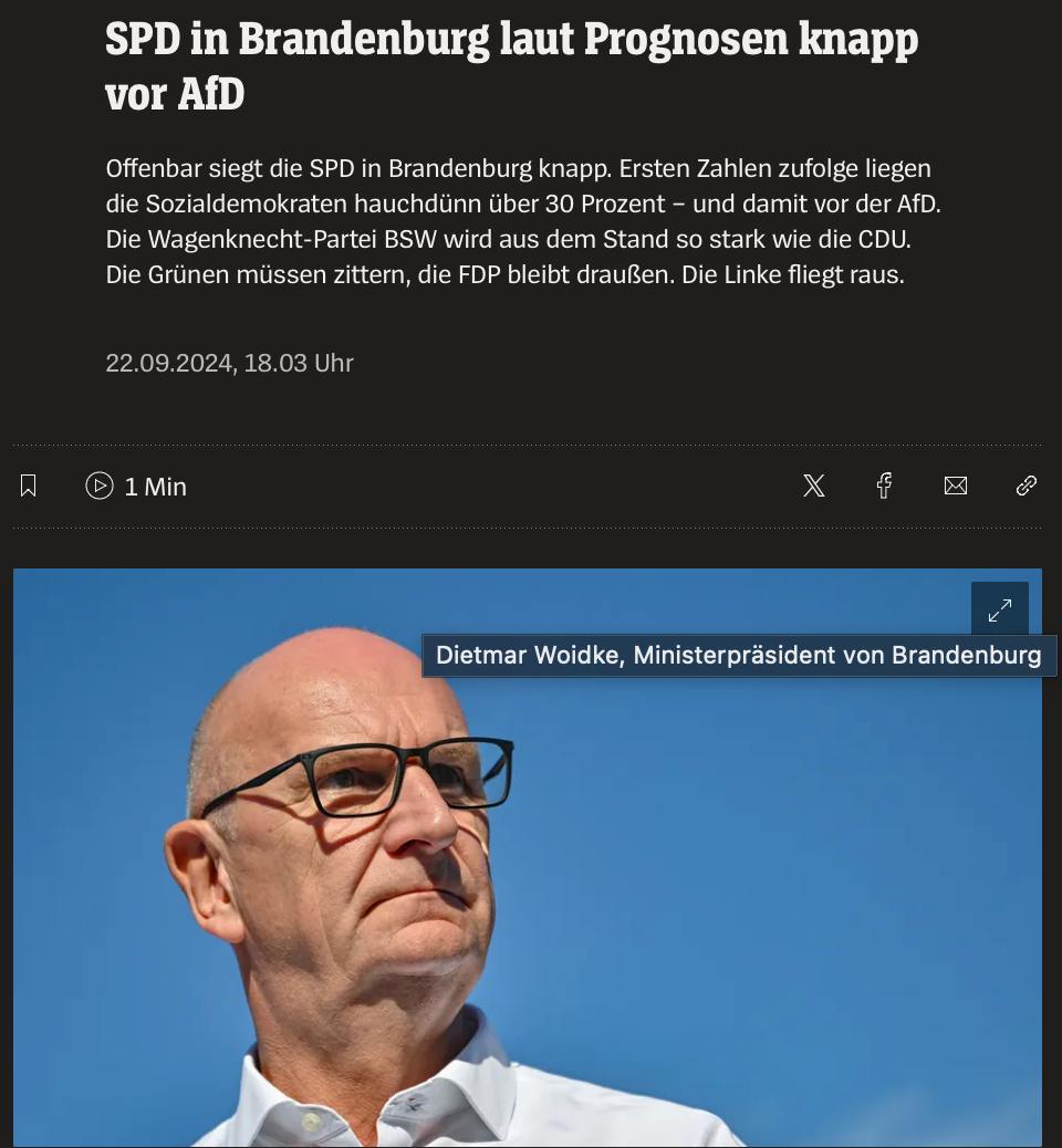 Между тем общественный вещатель ARD публикует прогноз итогов голосования в немецкой земле Бранденбург.