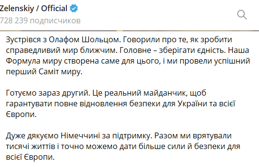 "Говорили о том, как сделать справедливый мир более близким. Главное – сохранять единство. Наша формула мира создана именно для этого, и мы провели успешный первый саммит мира. Готовим сейчас второй. Это реальная площадка, чтобы гарантировать полное восстановление безопасности для Украины и всей Европы", – заявил украинский президент.