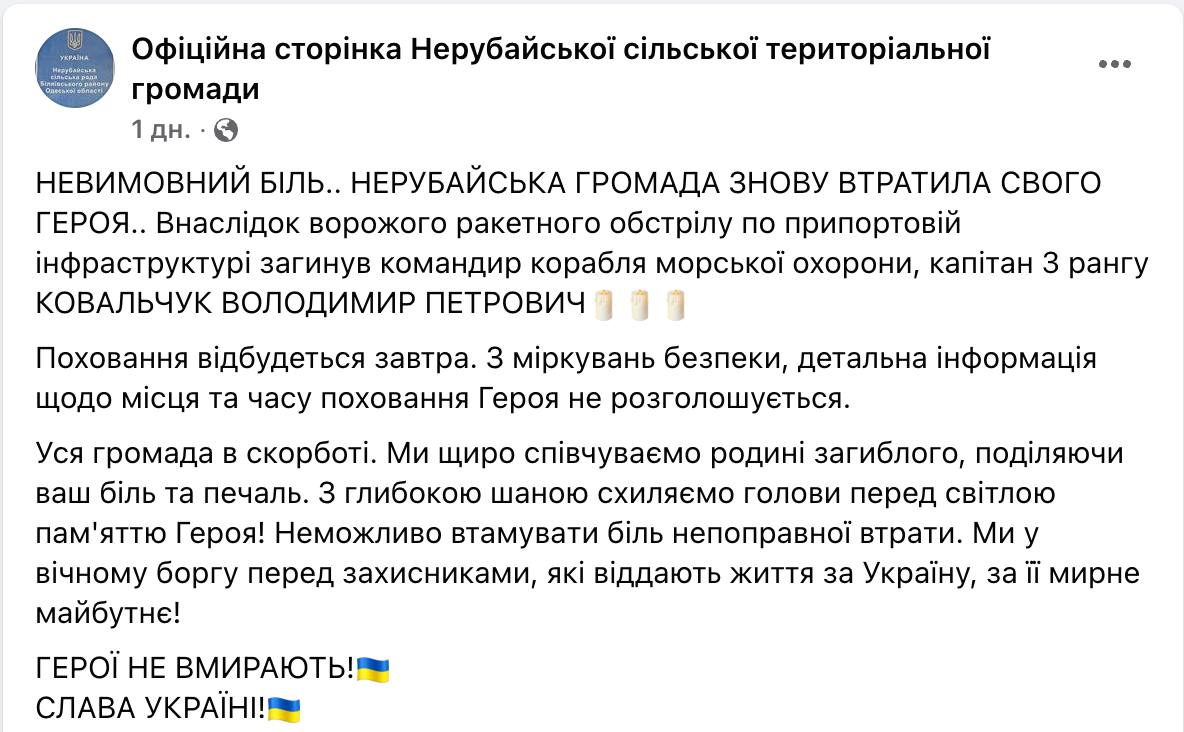 14.54 В результате ракетного обстрела погиб командир корабля морской охраны, капитан 3-го ранга Владимир Ковальчук.