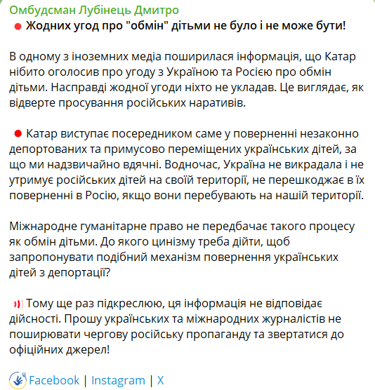 "Катар выступает посредником именно в возвращении незаконно депортированных и принудительно перемещенных украинских детей, за что мы очень благодарны. В то же время Украина не похищала и не удерживает российских детей на своей территории, не препятствует их возвращению в Россию, если они находятся на нашей территории", - пишет Лубинец.