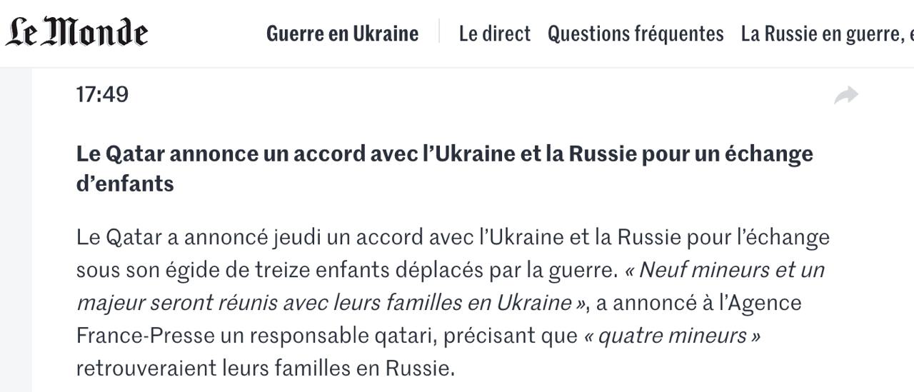 10:07 При посредничестве Катара состоится обмен детьми между Украиной и РФ, сообщает Le Monde.