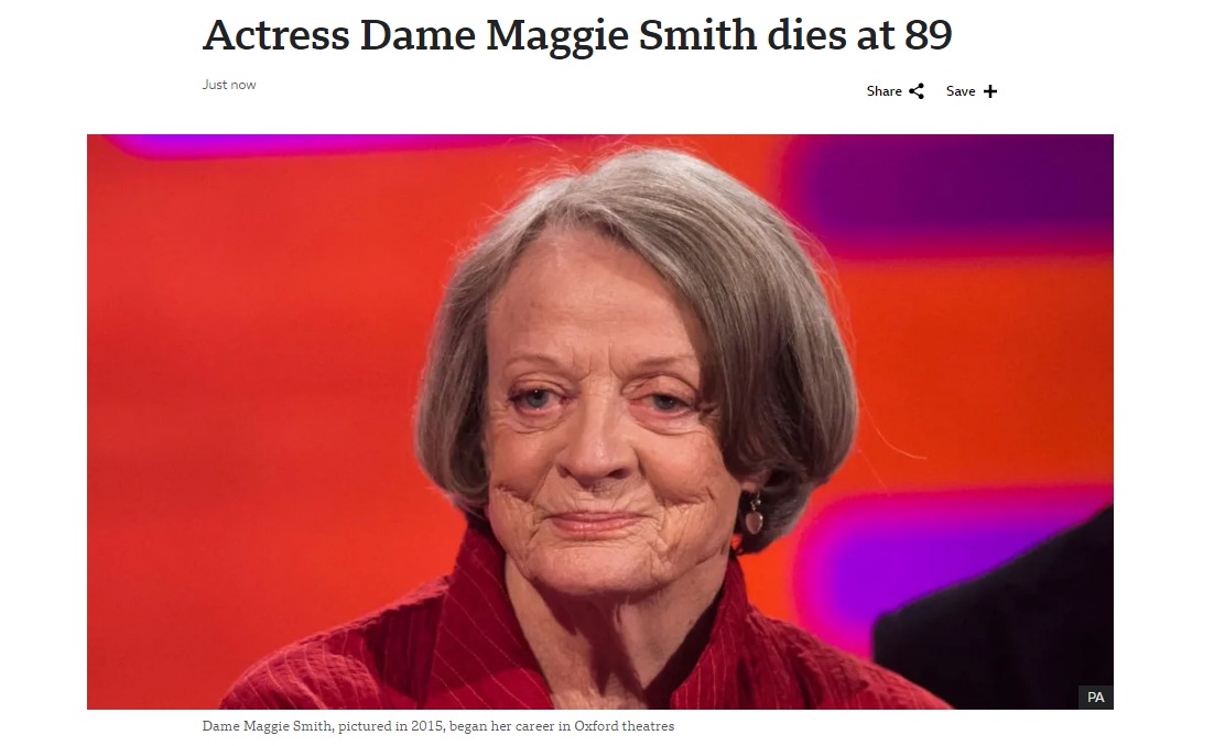 Британская актриса Мэгги Смит, известная по фильмам о Гарри Поттере и сериалу "Аббатство Даунтон", умерла в возрасте 89 лет.