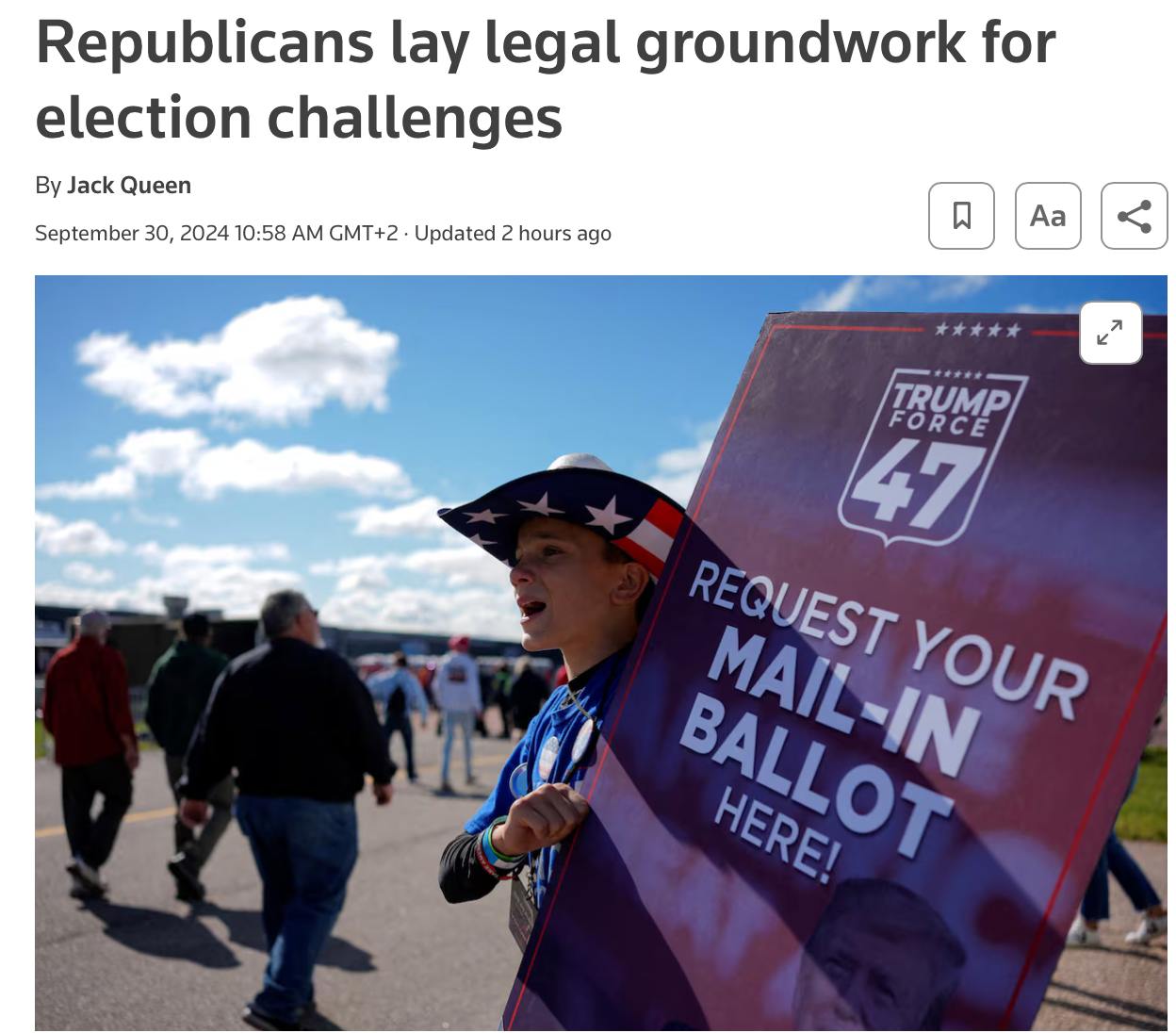 Агентство пишет, сторонники Дональда Трампа "закладывают правовую основу для оспаривания выборов". Они участвуют в более чем 120 судебных процессах в 26 штатах, чтобы отменить еще до выборов ряд избирательных практик.