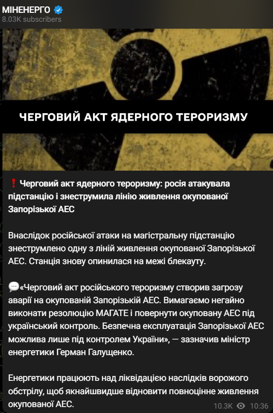 "Очередной акт российского терроризма создал угрозу аварии на оккупированной Запорожской АЭС. Требуем немедленно выполнить резолюцию МАГАТЭ и вернуть оккупированную АЭС под украинский контроль. Безопасная эксплуатация Запорожской АЭС возможна только под контролем Украины", – отметил министр энергетики Герман Галущенко.