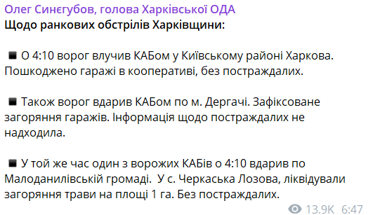 "В 4:10 враг попал КАБом в Киевском районе Харькова. Повреждены гаражи в кооперативе, без пострадавших", - написал он.