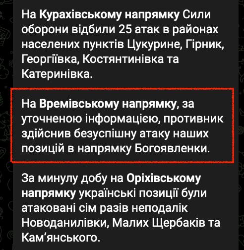 После этого ГШУ сообщал о том, что российские войска "безуспешно" атакуют Богоявленку. Угледар уже не упоминался.