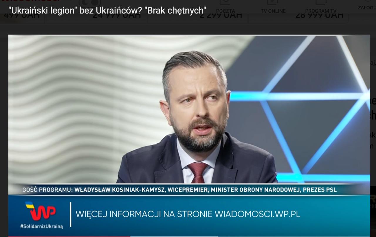 13:16 Среди украинцев за границей все еще не нашлось достаточно желающих для формирования Украинского легиона, заявил польский министр нацобороны Владислав Косиняк-Камыш в эфире местного ТВ.