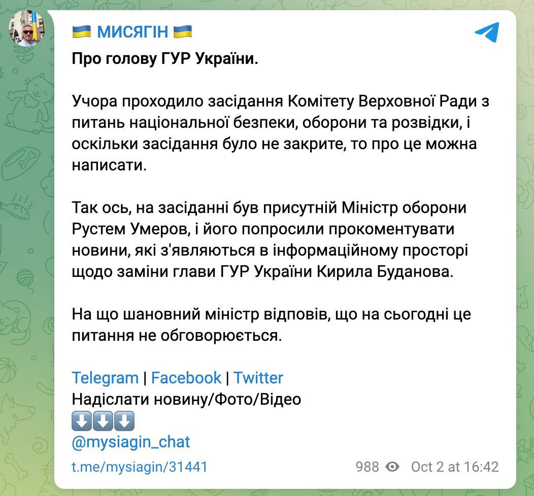 "Вчера проходило заседание комитета Верховной Рады по вопросам национальной безопасности, обороны и разведки, и поскольку заседание было не закрыто, то об этом можно написать. Так вот, на заседании присутствовал министр обороны Рустем Умеров, и его попросили прокомментировать новости, появляющиеся в информационном пространстве, о замене главы ГУР Украины Кирилла Буданова. На что уважаемый министр ответил, что сегодня этот вопрос не обсуждается", - сказано в публикации.