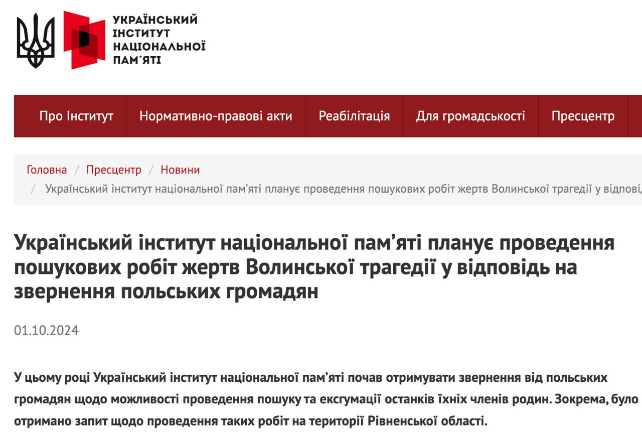 "В этом году Украинский институт национальной памяти начал получать обращения от польских граждан о возможности проведения поиска и эксгумации останков их членов семей. В частности, был получен запрос о проведении таких работ на территории Ровенской области. По результатам рассмотрения обращения, поступившего в сентябре 2024 года, Украинский институт национальной памяти намерен включить поисковые работы на территории Ровенской области в план работы и мероприятий на 2025 год", - сказано в сообщении.