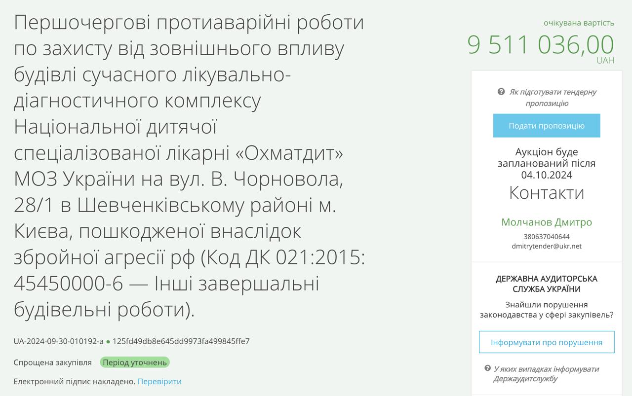 Согласно информации на Prozorro, за 9,5 миллиона хотят выполнить первоочередные противоаварийные работы по защите от внешнего воздействия лечебно-диагностического комплекса. Аукцион стартует после 4 октября.