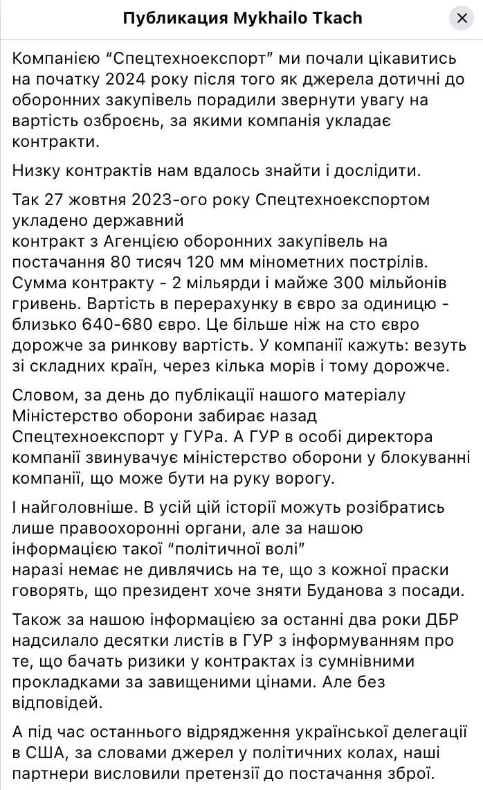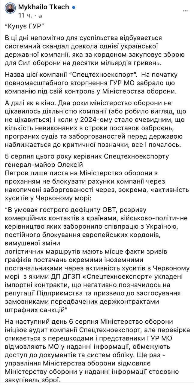 В начале августа Минобороны Украины начало аудит “Спецтехноэкспорта” из-за накопившихся долгов. При этом, утверждает Ткач, представители ГУР чинили препятствия аудиту, отказываясь выдавать документы и открывать доступ в закрытые системы.
