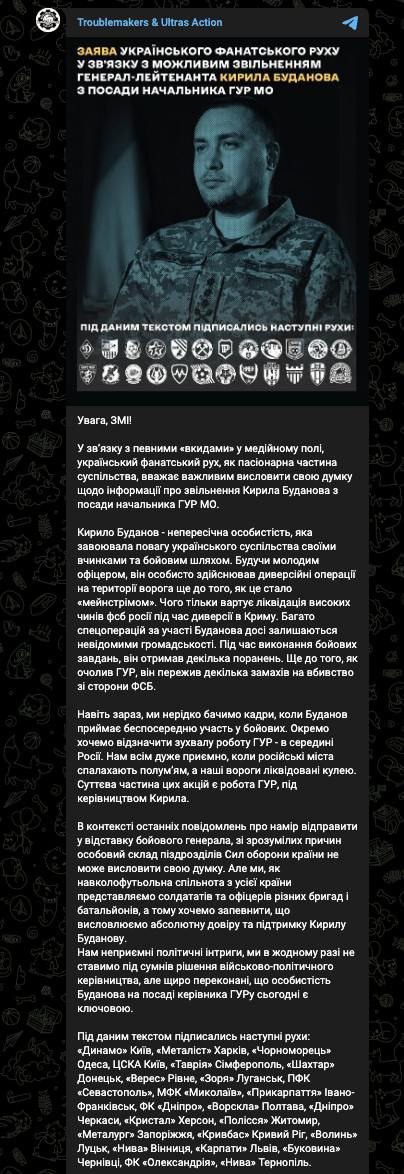 Они заявили, что выражают "абсолютное доверие и поддержку Кириллу Буданову". Также фанаты, из которых формируется ряд подразделений ГУР, "искренне убеждены, что личность Буданова в должности руководителя ГУР сегодня является ключевой".