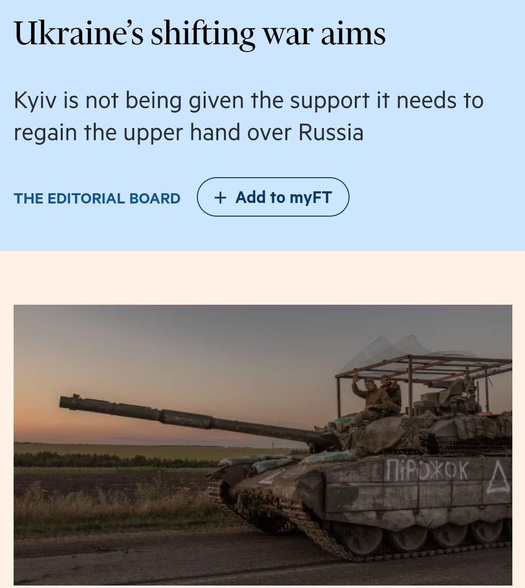 "В Вашингтоне, некоторых западных столицах и коридорах Киева настроения меняются: от решимости, что война может закончиться только с изгнанием российской армии с территории Украины, к вынужденному признанию, что лучший шанс на будущее - это переговорное урегулирование, которое сохранит большую часть страны", - говорится в статье.