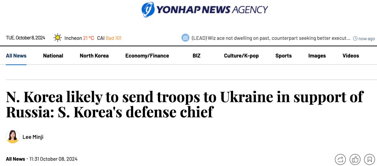 "Поскольку Россия и Северная Корея подписали взаимный договор, схожий с военным союзом, возможность такого развертывания весьма вероятна", — заявил министр обороны Южной Кореи Ким Ён Хён в местном парламенте.