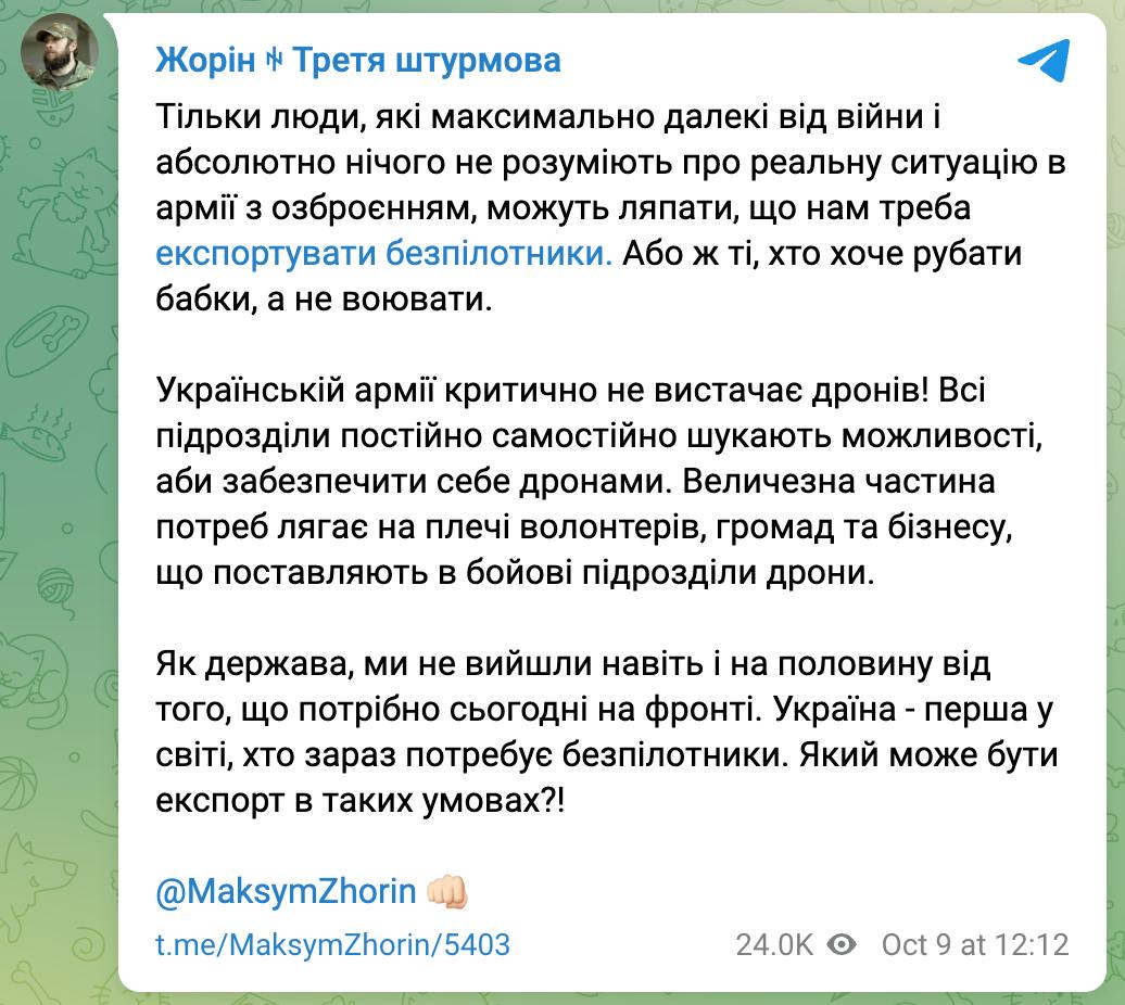 "Украинской армии критически не хватает дронов! Все подразделения постоянно самостоятельно ищут возможности, чтобы обеспечить себя дронами. Большая часть потребностей ложится на плечи волонтеров, общин и бизнеса, поставляющих в боевые подразделения дроны. Как государство мы не вышли даже и на половину от того, что нужно сегодня на фронте. Какой может быть экспорт в таких условиях?" - пишет Жорин.
