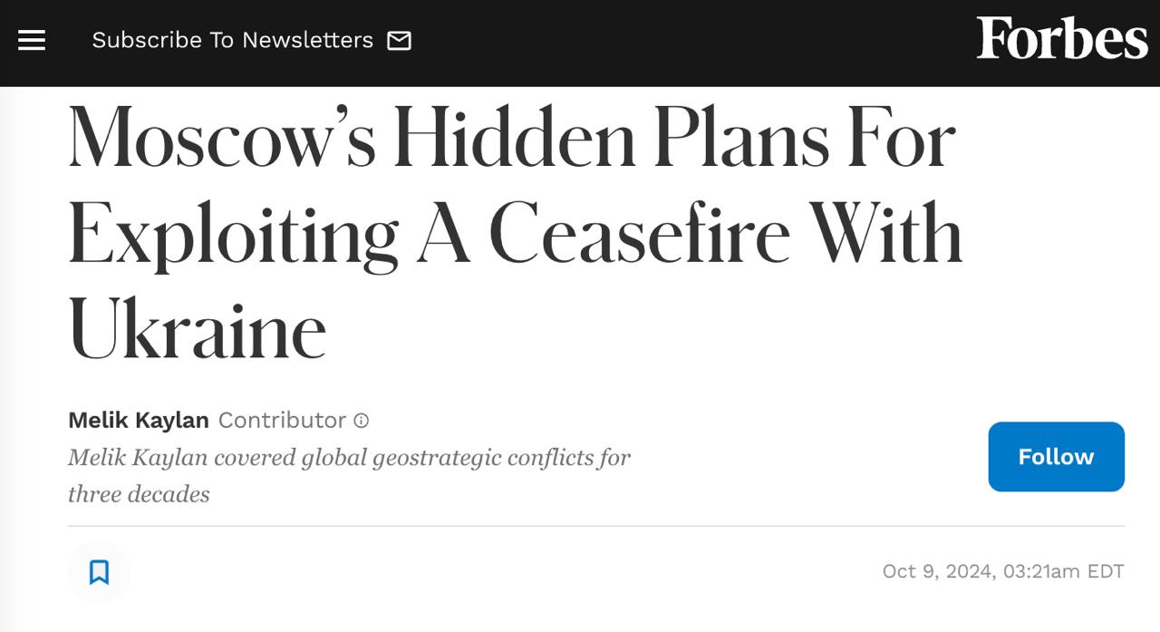 11.45 Forbes опубликовал статью об угрозе мятежа в Украине и других возможных негативных последствиях заключения мирного соглашения по формуле "НАТО в обмен на территории".