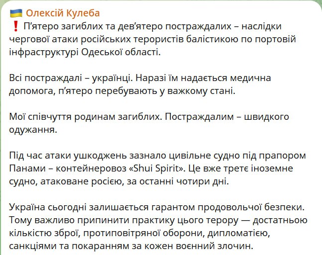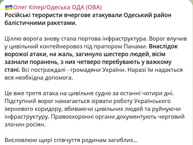 22.47 В Одесской области уже шесть погибших в результате удара по порту, сообщил глава ОВА Кипер.