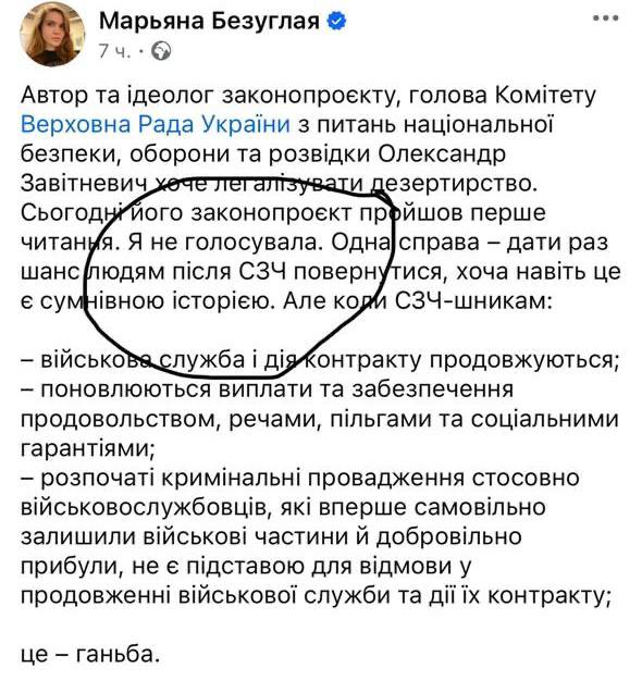 Народный депутат Марьяна Безуглая заявила, что не голосовала за законопроект о самовольном оставлении части (СЗЧ - укр), назвав его "легализацией дезертирства" и раскритиковав главу оборонного комитета Александра Завитневича.