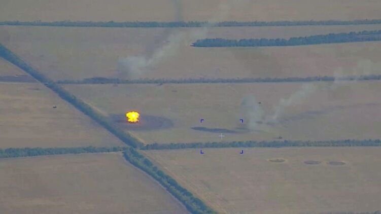 На видео заметно, как система ПВО запускает ракеты с земли, а потом по ней идет прилет. Все это снимает разведывательный беспилотник.