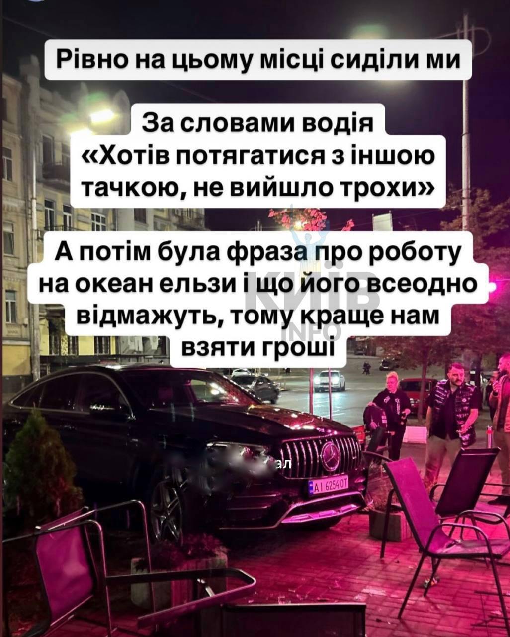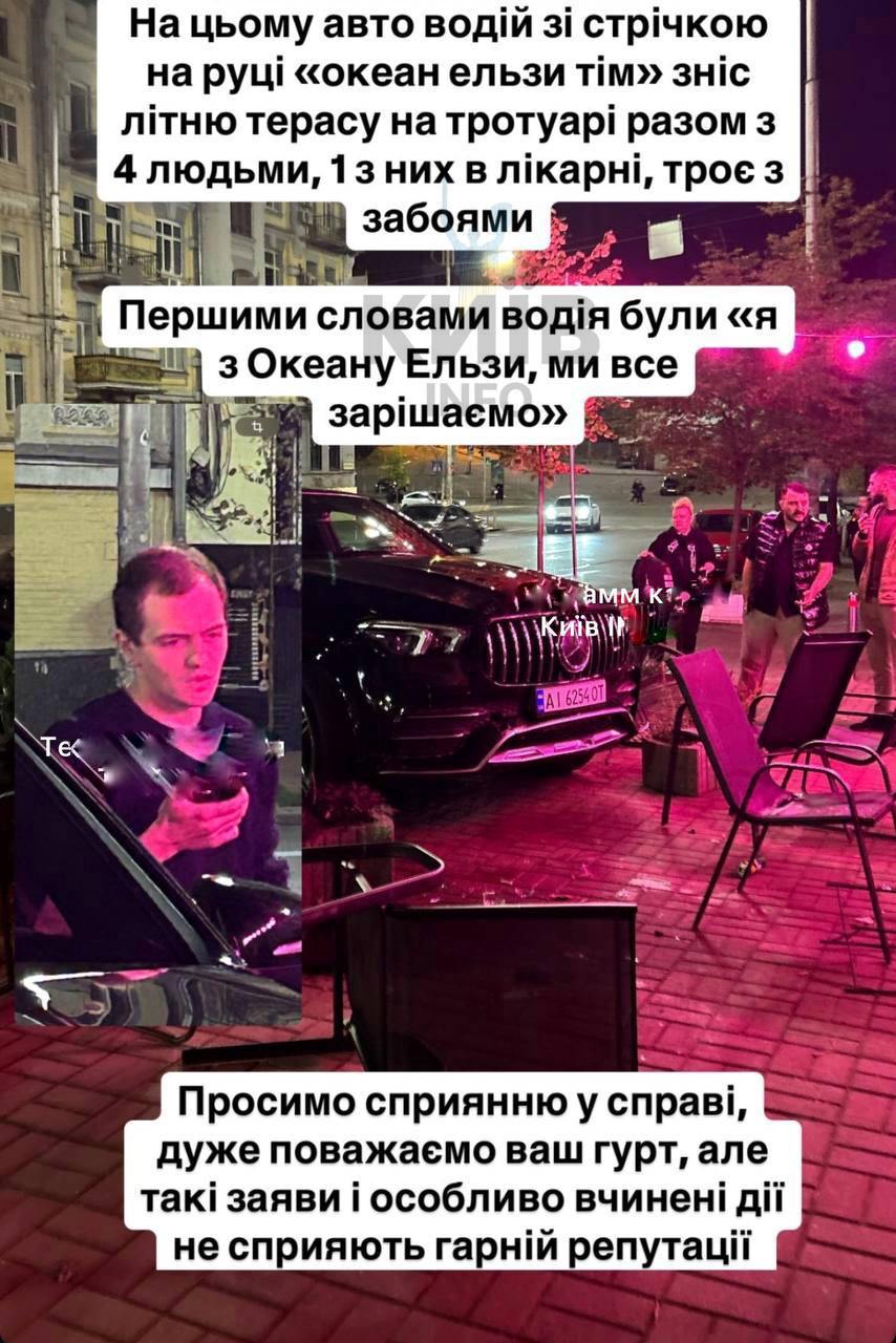 В Киеве Mercedes влетел в людей на летней площадке ресторана. Водителем представился членом команды группы "Океан Эльзы" Святослава Вакарчука.