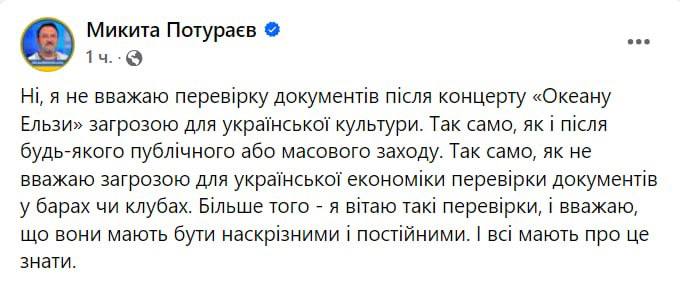 "Я не считаю проверку документов после концерта "Океана Эльзы" угрозой украинской культуре. Так же, как и после любого публичного или массового мероприятия. Так же, как не считаю угрозой украинской экономике проверки документов в барах или клубах. Более того – я приветствую такие проверки, и считаю, что они должны быть сквозными и постоянными. И все должны об этом знать", - заявил Потураев.