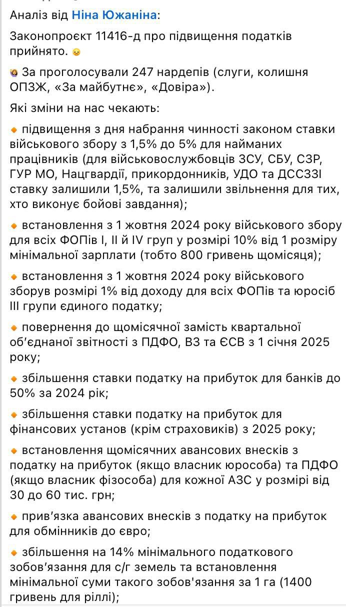Народный депутат Украины Нина Южанина приводит основные положения принятого Верховной Радой законопроекта о масштабном повышении налогов: