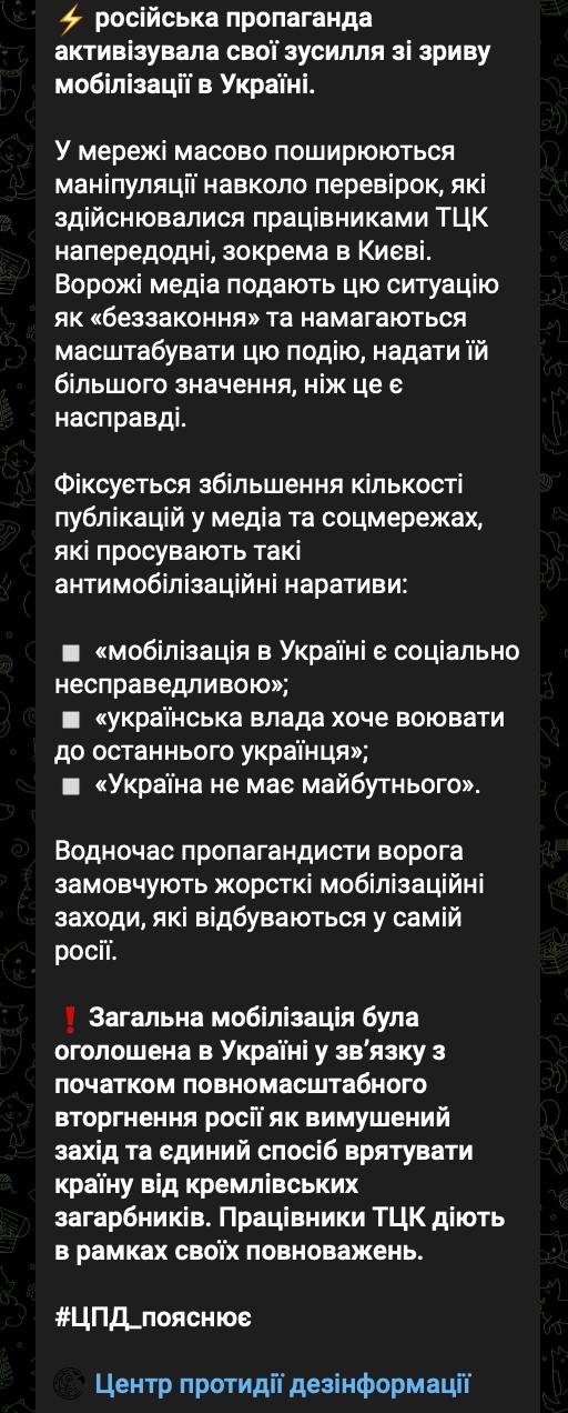"В сети массово распространяются манипуляции вокруг проверок, проводимых работниками ТЦК накануне, в частности, в Киеве. Вражеские медиа представляют эту ситуацию как беззаконие и пытаются масштабировать это событие, придать ему большее значение, чем это на самом деле", - заявили в ЦПД.