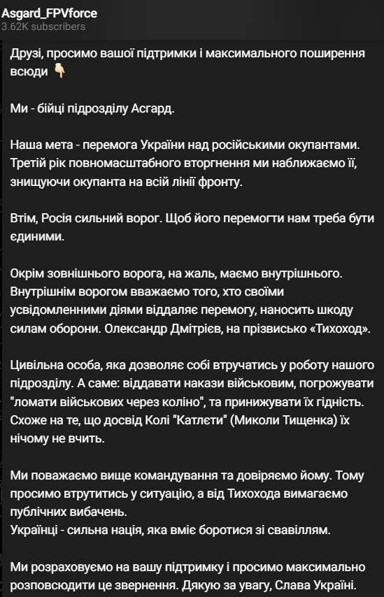 Бойцы подразделения "Асгард" заявили, что некий Александр Дмитриев (Тихоход) представился советником командующего Сухопутных войск Александра Павлюка и начал раздавать им приказы, не имея на это полномочий. А также унижал и угрожал за неподчинение.