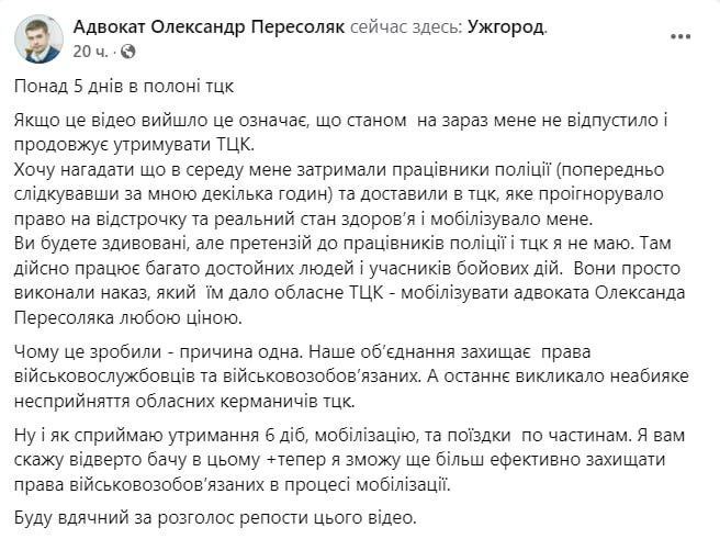 "Они просто выполнили приказ, данный им областным ТЦК: мобилизовать адвоката Александра Пересоляка любой ценой. Почему это сделали – причина одна. Наше объединение защищает права военнослужащих и военнообязанных. А последнее вызвало незаурядное невосприятие областных вождей ТЦК", – объяснил он.