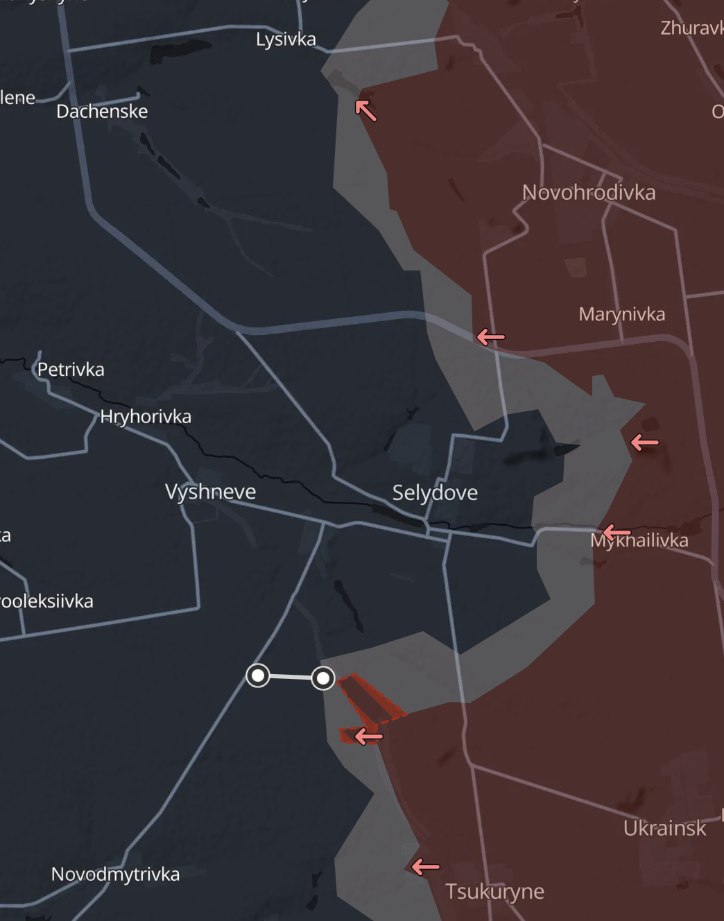 Мы уже рассказывали о том, что российские войска пытаются прежде всего перерезать трассу Селидово - Покровск и Селидово - Курахово. В районе Покровской трассы ожесточенные бои идут за Лысовку, куда уже вошли россияне. А до Кураховской дороги к югу от Селидово россиянам осталось около километра.