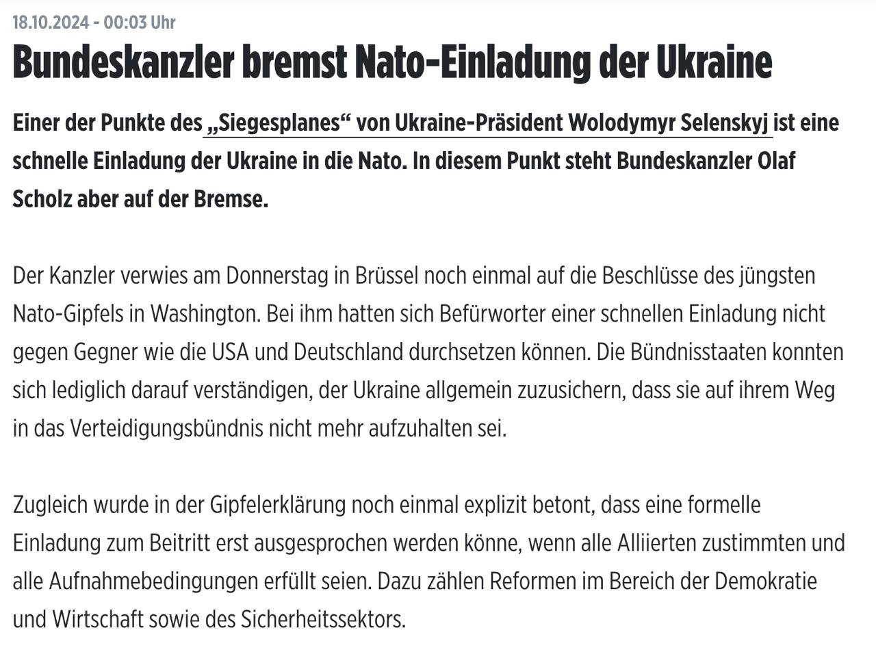 Выступая в Брюсселе, канцлер заявил, что будет блокировать быстрое приглашение Украины в НАТО. Он сослался на недавний саммит в Вашингтоне, на котором не был достигнут консенсус по этому вопросу: против выступали США и ФРГ.